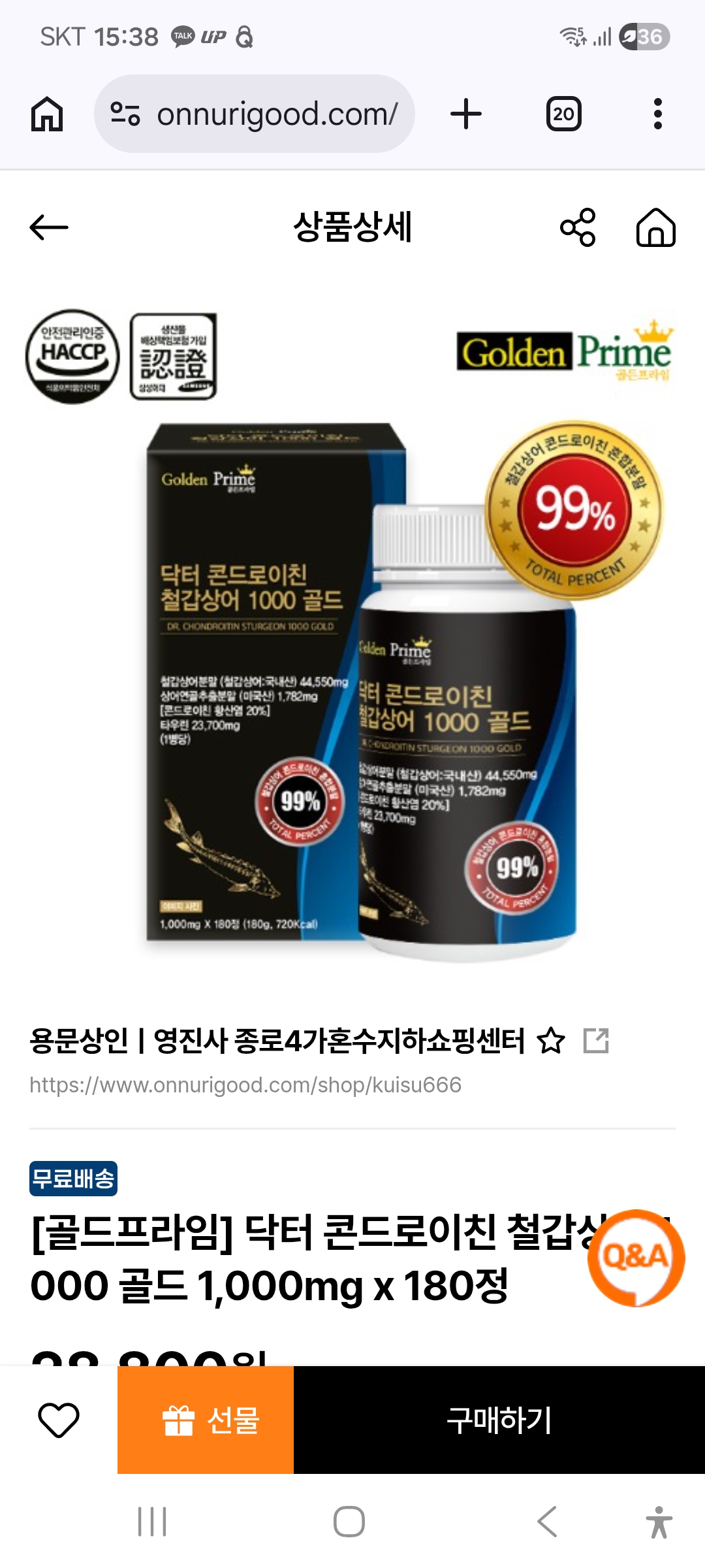 [골드프라임] 닥터 콘드로이친 철갑상어 1000 골드 1,000mg x 180정